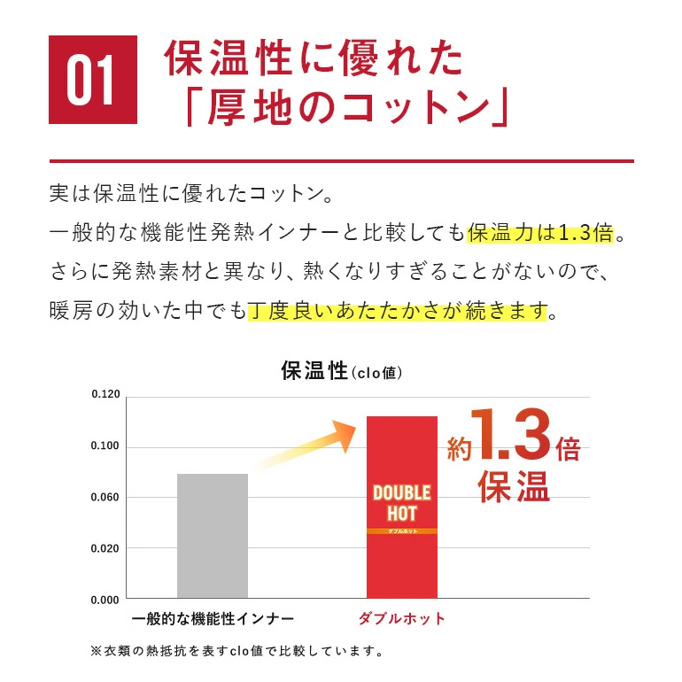 一般的な機能性インナーに比べ保温性は1.3倍と高く、暖房が効いた中でもちょうど良い温度を保ちます。