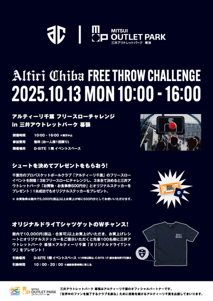 - 【10/13(月・祝)】アルティーリ千葉 フリースローチャレンジ in 三井アウトレットパーク 幕張
