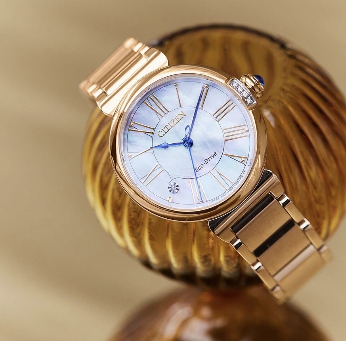 幸せへと誘うスズランの香水瓶をイメージして3時の位置にあしらった4ポイントのダイヤモンドとりゅうずを彩るブルーのアクセントが、腕元を見るたびに可憐な、スズランの花を手にした時の幸せな気持ちを呼び起こしてくれるモデルです。