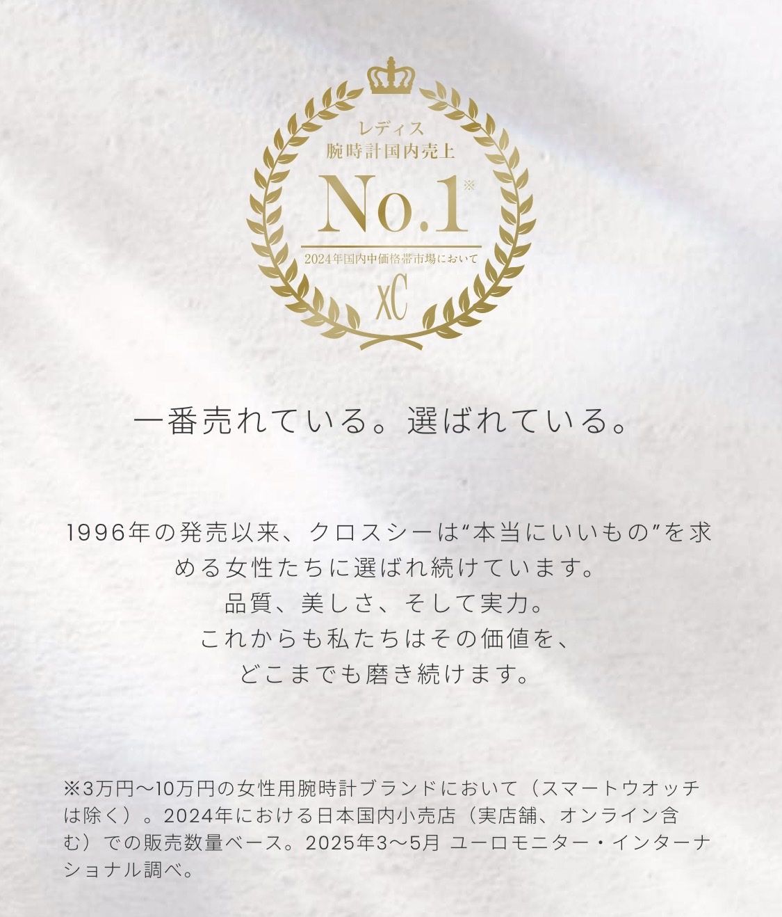優しくフェミニンなクロスシーらしいケースライン。軽く、薄く、大きすぎないサイズ感で、スクエアを柔らかな印象のモデルです。