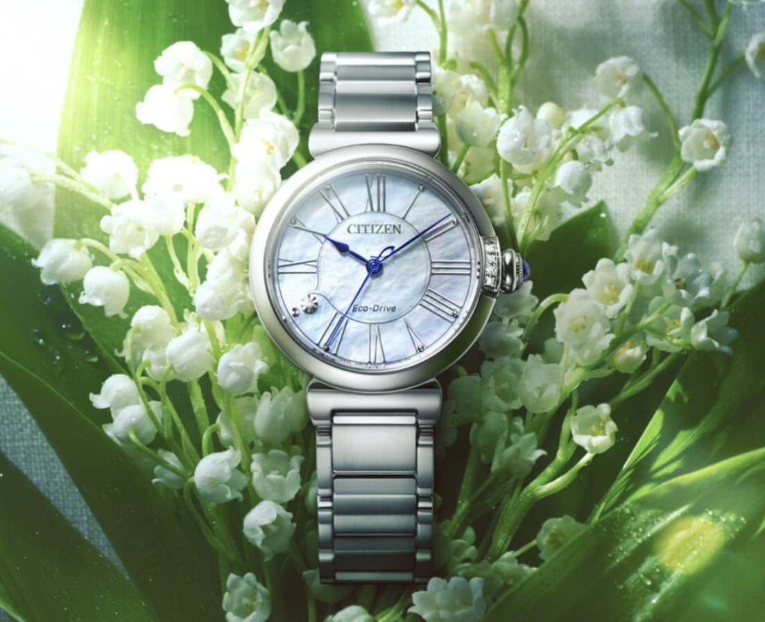 スズランを思わせる柔らかな曲線のフォルムと白蝶貝の文字板が上品なモデル。