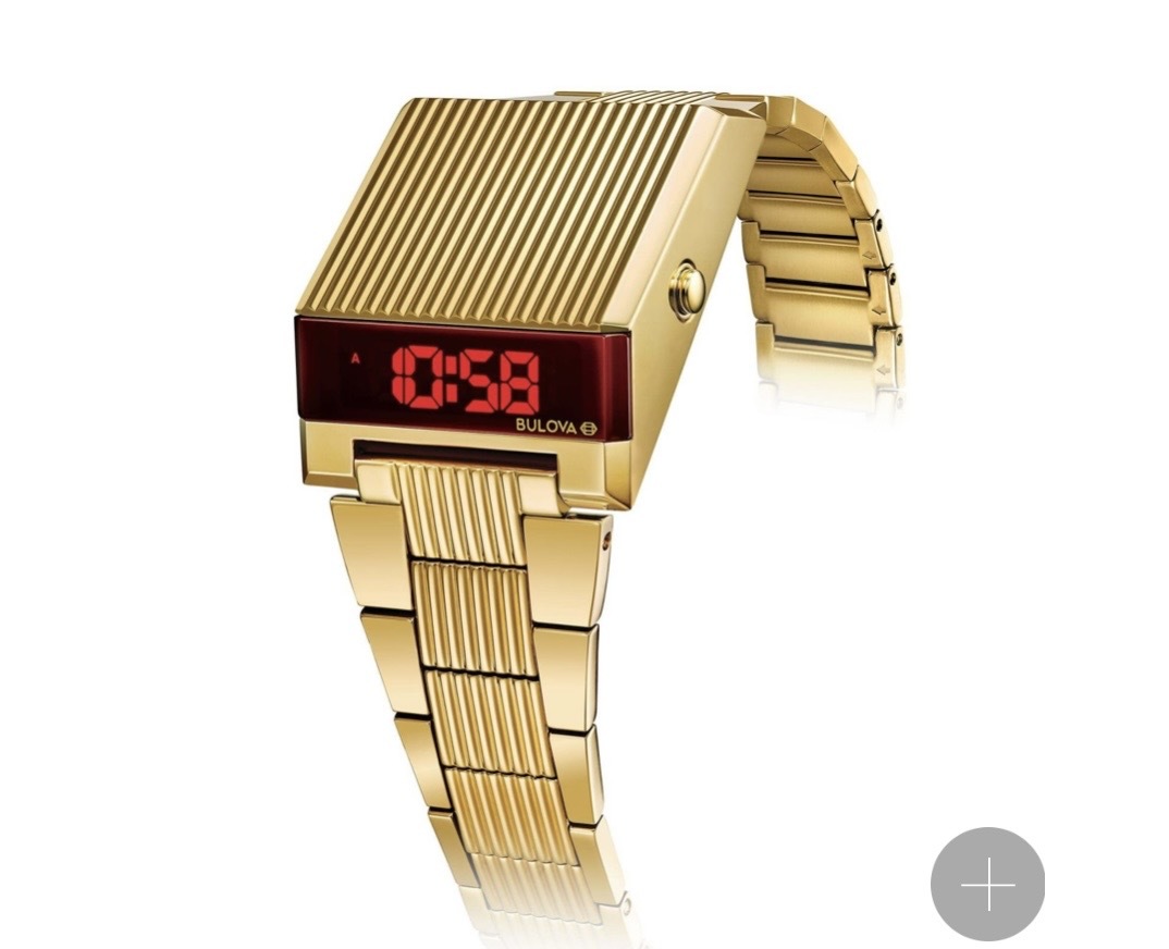 イエローゴールドケースに赤色LED、ゴドロン装飾が入った台形のケース、70年代のなつかしさ溢れるデジタルウォッチです。