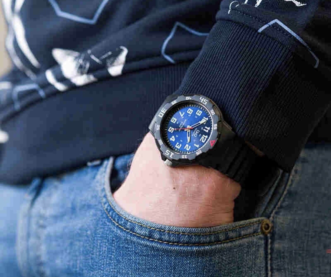 鮮やかなメタリックブルーの文字板に、暗闇でも時間が確認出来る蓄光インデックス、10気圧防水で水にも強いモデルです。