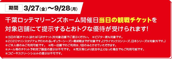 - 観戦チケット提示でおトク!マリーンズ割 3/27(金)~9/28(月)