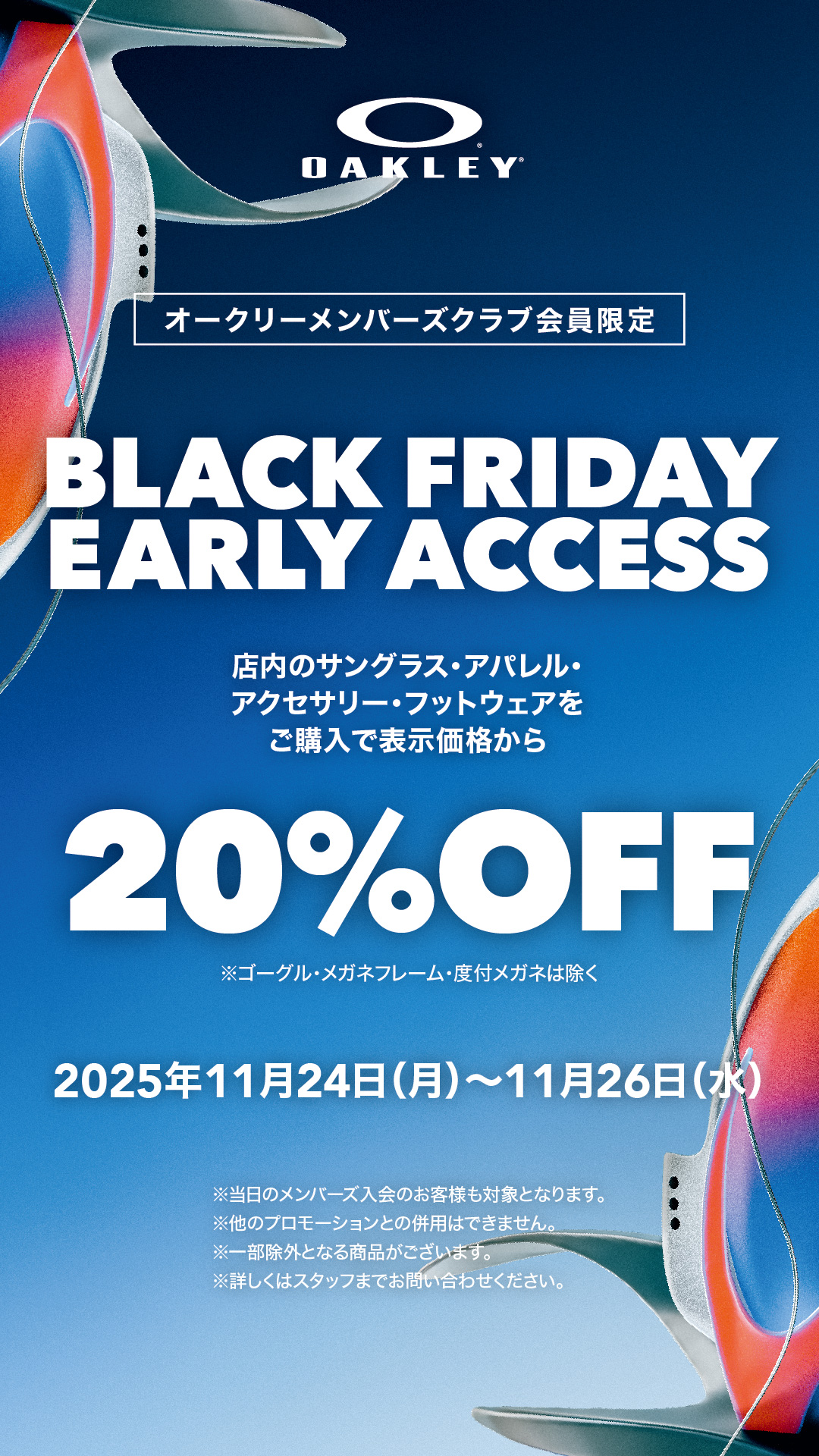 オークリーでは11/24(月)~11/26(水)の期間限定で、店内のサングラス、アパレル、フットウェア、アクセサリー商品が表示価格から20%OFFとなるキャンペーンを開催いたします。