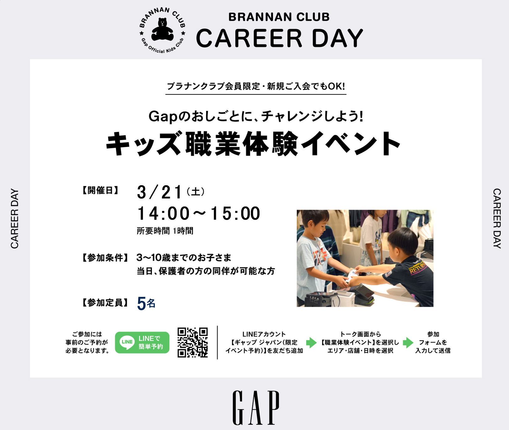 参加方法:LINEアカウント【ギャップジャパン(限定イベント予約)】を友達追加から参加フォームへ入力送信