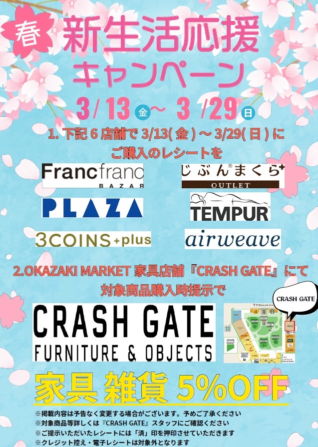 下記6店舗で3/13(金)~3/29(日)の期間中にご購入のレシートを『CRASH GATE』の対象商品購入時提示で家具 雑貨5%OFF!!