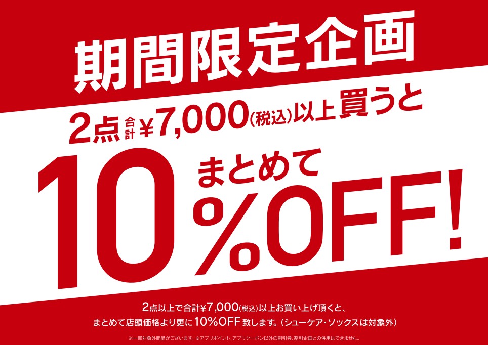 店内商品2点以上、税込7,000以上お買い上げでお会計時に10%OFF。