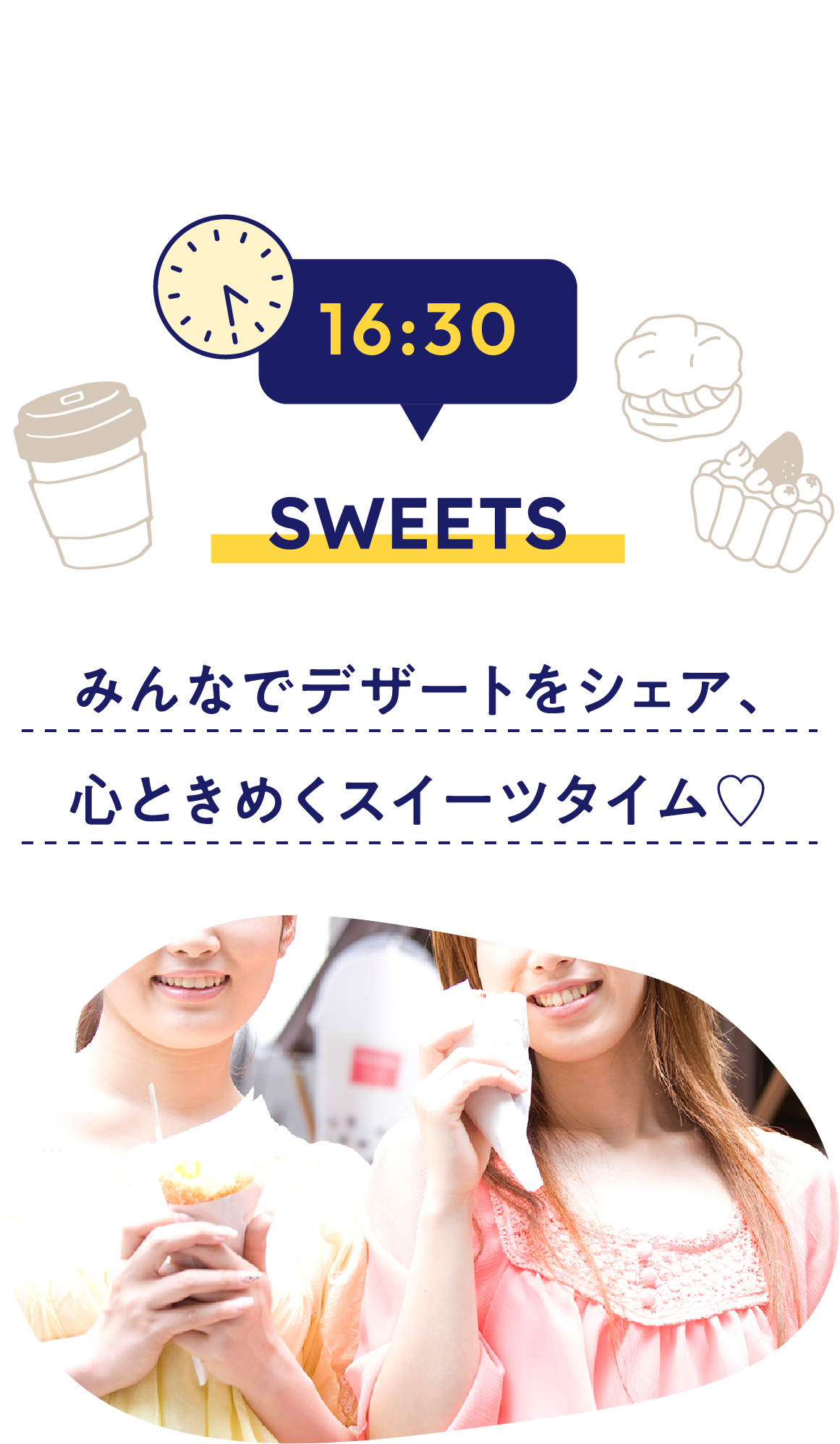 小腹が空いてきたら、人気のスイーツ店へ。みんなで違うスイーツを買って、シェアしながら食べ比べ。どれも美味しくて、会話も弾みます。