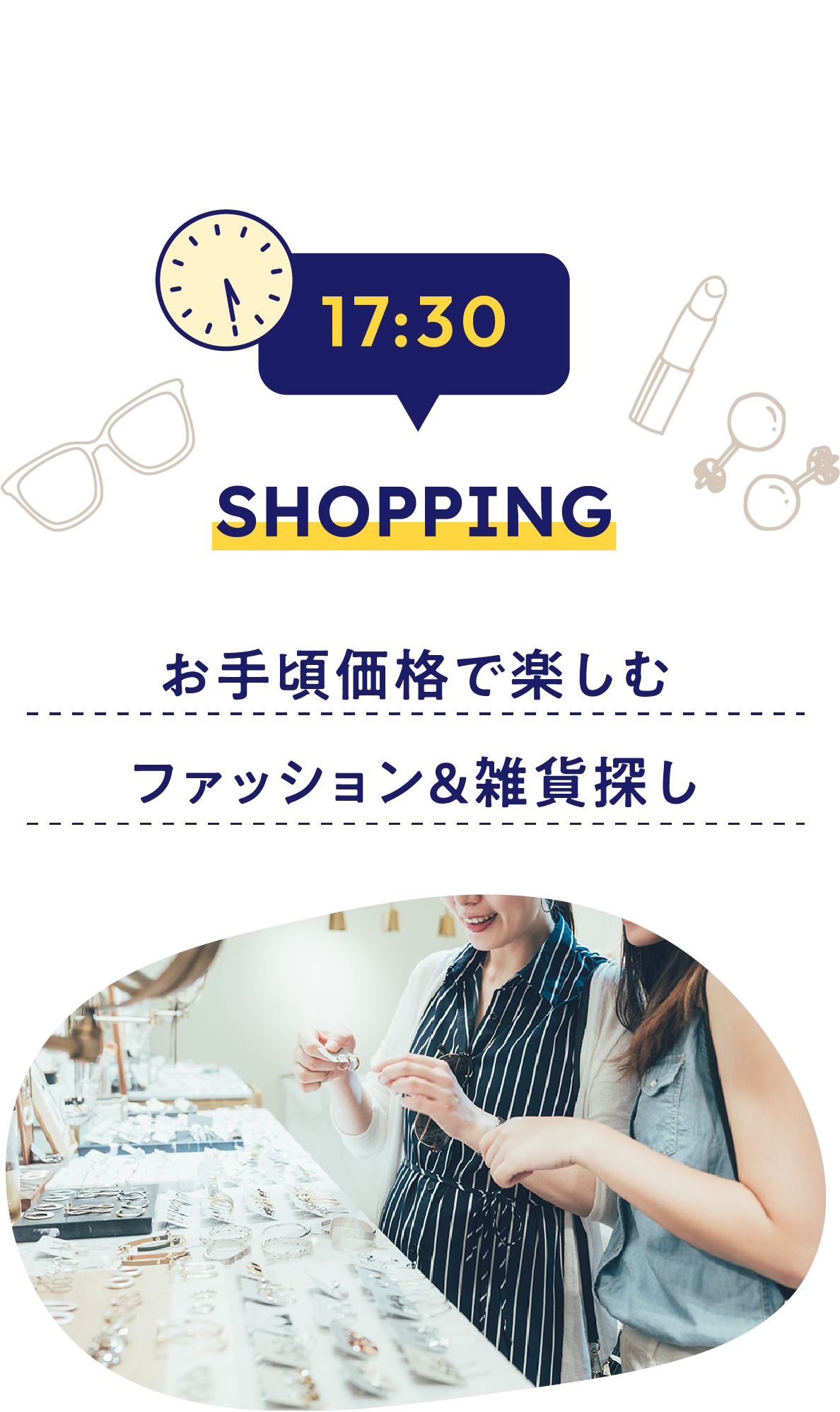 友達と「これ似合うね!」「いいじゃん!」と、おしゃべりしながら服や雑貨をチェック。流行りのアイテムも、アウトレットならではのお手頃価格で手軽に楽しめます。