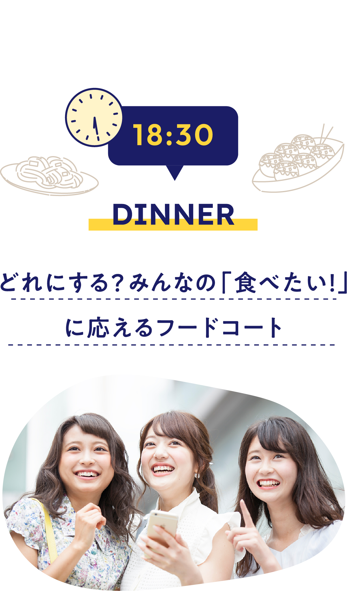 「今日は何食べる?」と、みんなでメニューを吟味。美味しいパスタや、熱々のたこ焼きなど、種類豊富なフードコートなら、みんなの「食べたい!」に応えられます。