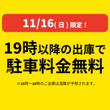【11/16(日)限定】19時以降の出庫で駐車料金無料!