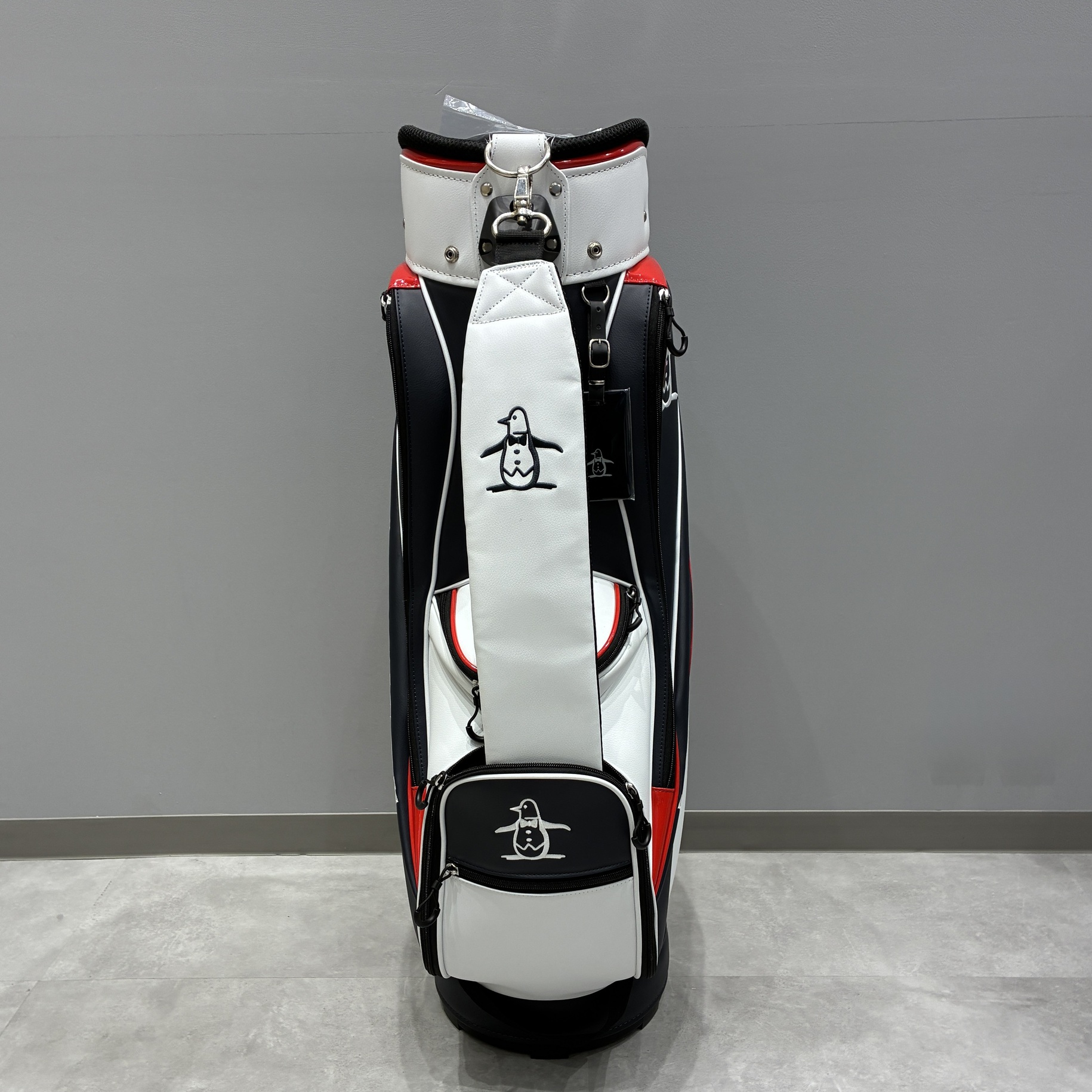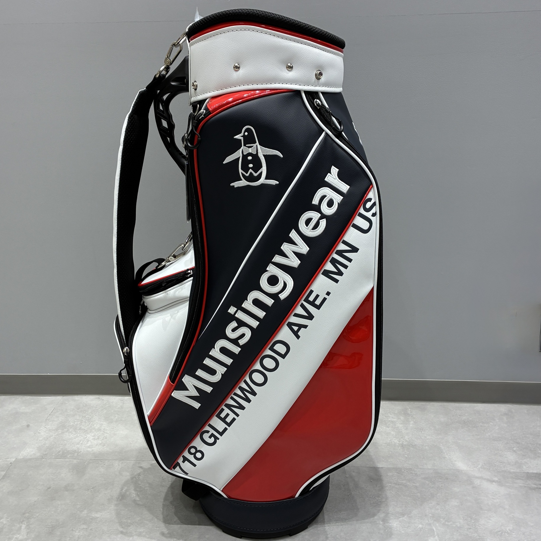 トリコロール配色がマンシングウェアらしいキャディバッグです。