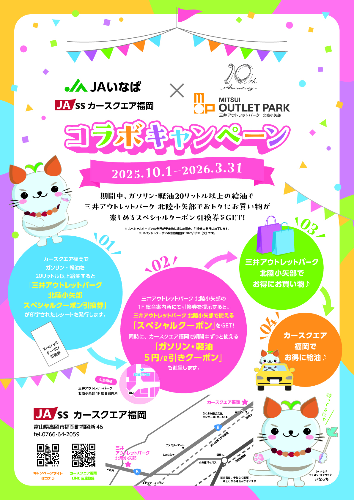 期間中、「カースクエア福岡」にてガソリン・軽油を 20リットル以上給油で、三井アウトレットパーク 北陸小矢部でオトクにお買物が楽しめる「スペシャルクーポン引換券」を進呈します。