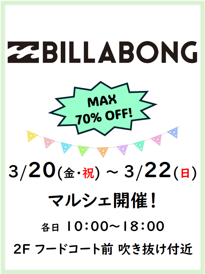 - 【2026/3/20(金・祝)~3/22(日)】BILLABONG スペシャルマルシェ開催!!