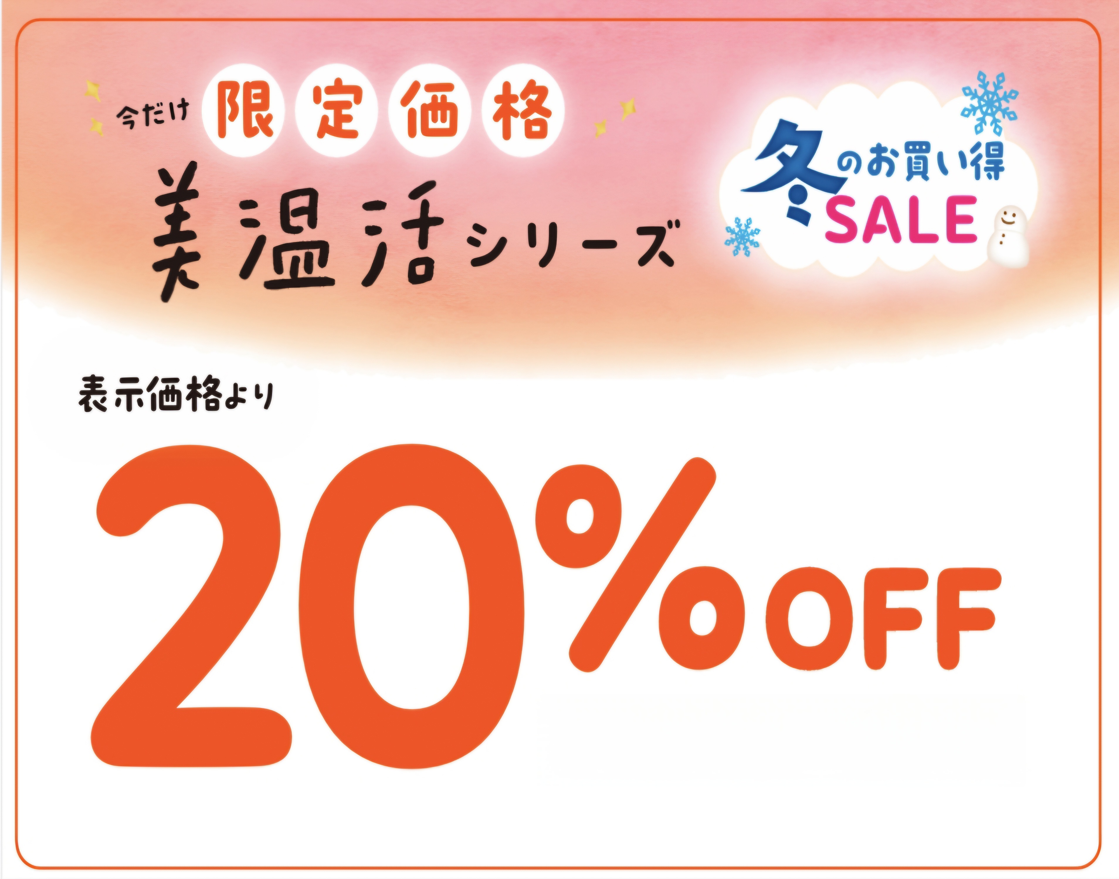 大人気のおふとん心地レディースインナーを始め靴下や腹巻き、レギンスやタイツなど美温活シリーズ商品が全品、表示価格より20%OFFとなります