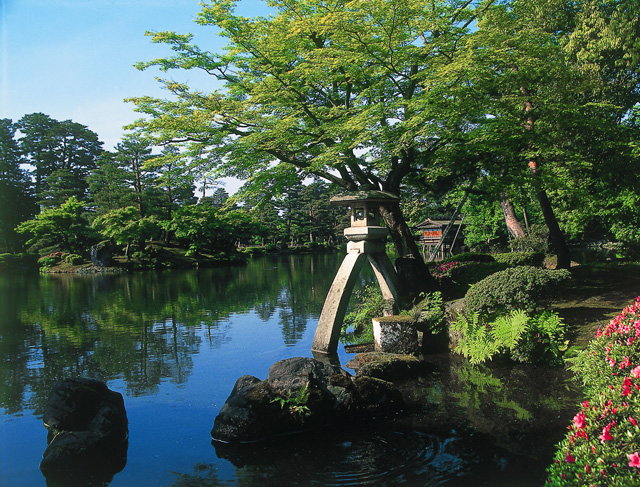 江戸時代の回遊林泉式庭園の特徴を今日に残す代表的庭園で、水戸の偕楽園、岡山の後楽園とともに日本の三名園と称されています。宏大、幽邃、人力、蒼古、水泉、眺望の六勝を兼ね備えるという意味から命名されました。ことじ灯籠、雁行橋、霞ヶ池など見どころが多数あります。