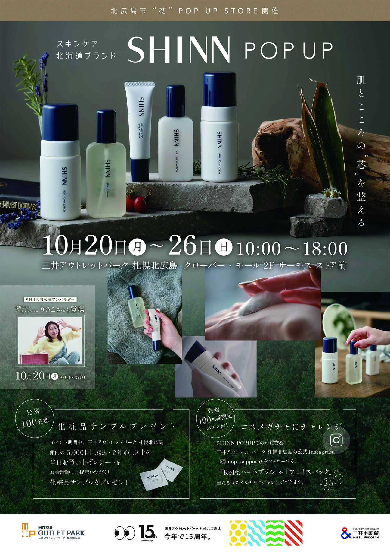 ポップアップ期間中、館内で税込5,000円以上をお買い上げの方先着100名様にSHINNスキンケアサンプルをプレセント。また、ポップアップにてお買い上げいただき三井アウトレットパーク 札幌北広島公式Instagramをフォローで、豪華景品が当たるコスメガチャにご参加いただけるキャンペーンも実施中です。