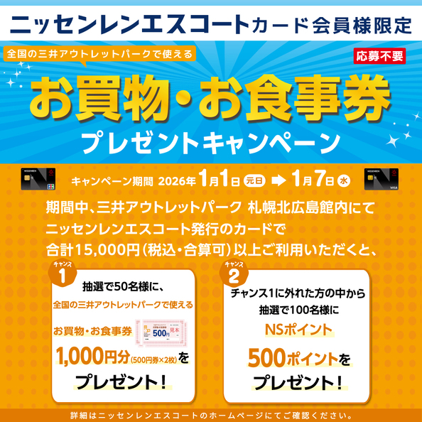期間中、三井アウトレットパーク 札幌北広島館内にてニッセンレンエスコート発行のカードで合計15,000円(税込・合算可)以上ご利用いただくと、