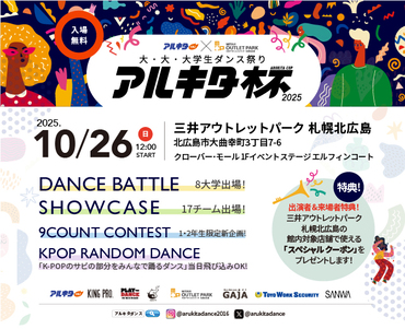 ![]()  アルキタ×三井アウトレットパーク 札幌北広島 Presents 大・大・大学生ダンス祭り「アルキタ杯2025」 音楽・ライブ 2025/10/26(日)