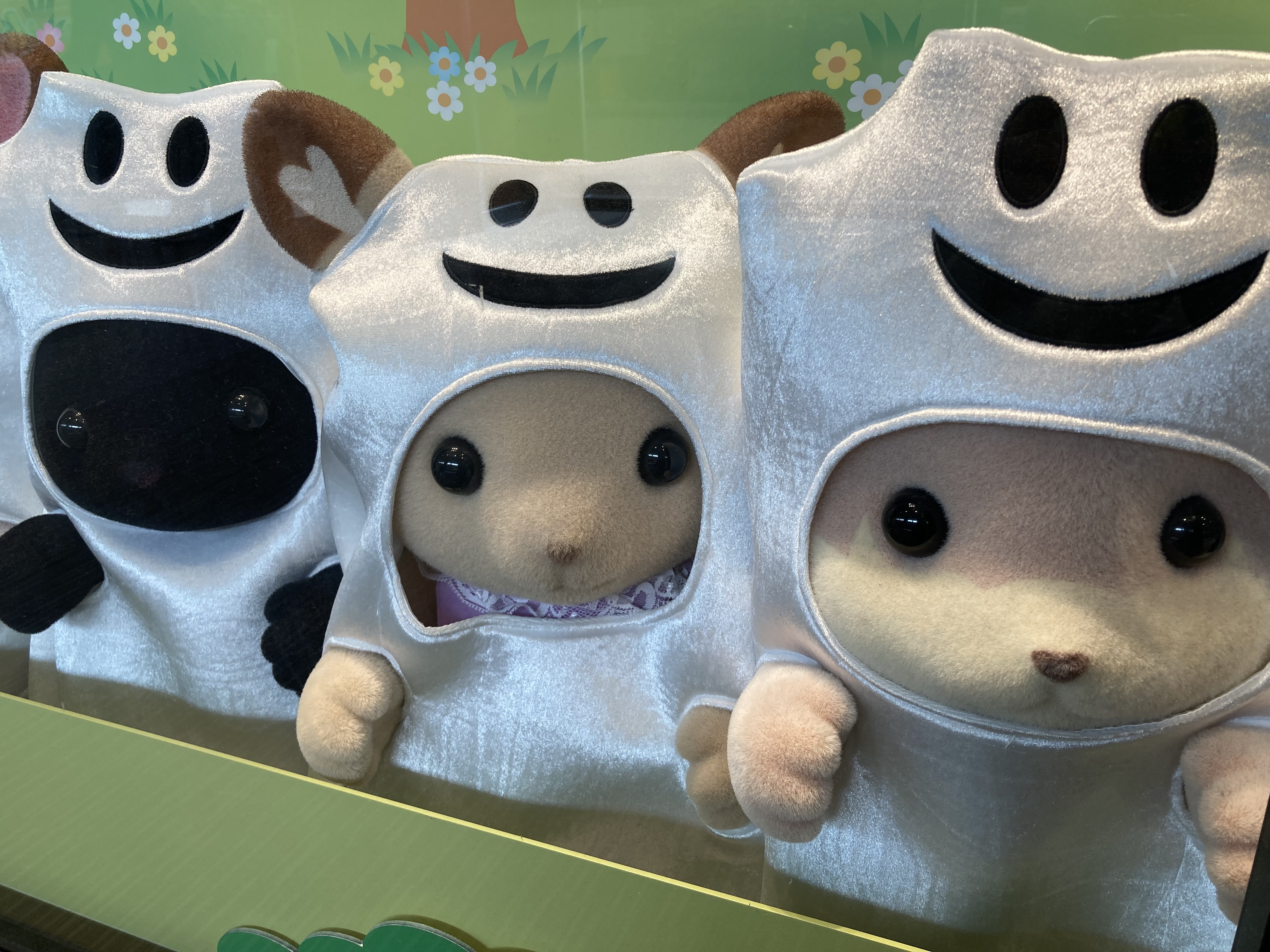 店舗入り口にディスプレイされているお人形たちにハロウィンのコスチュームを着せました!