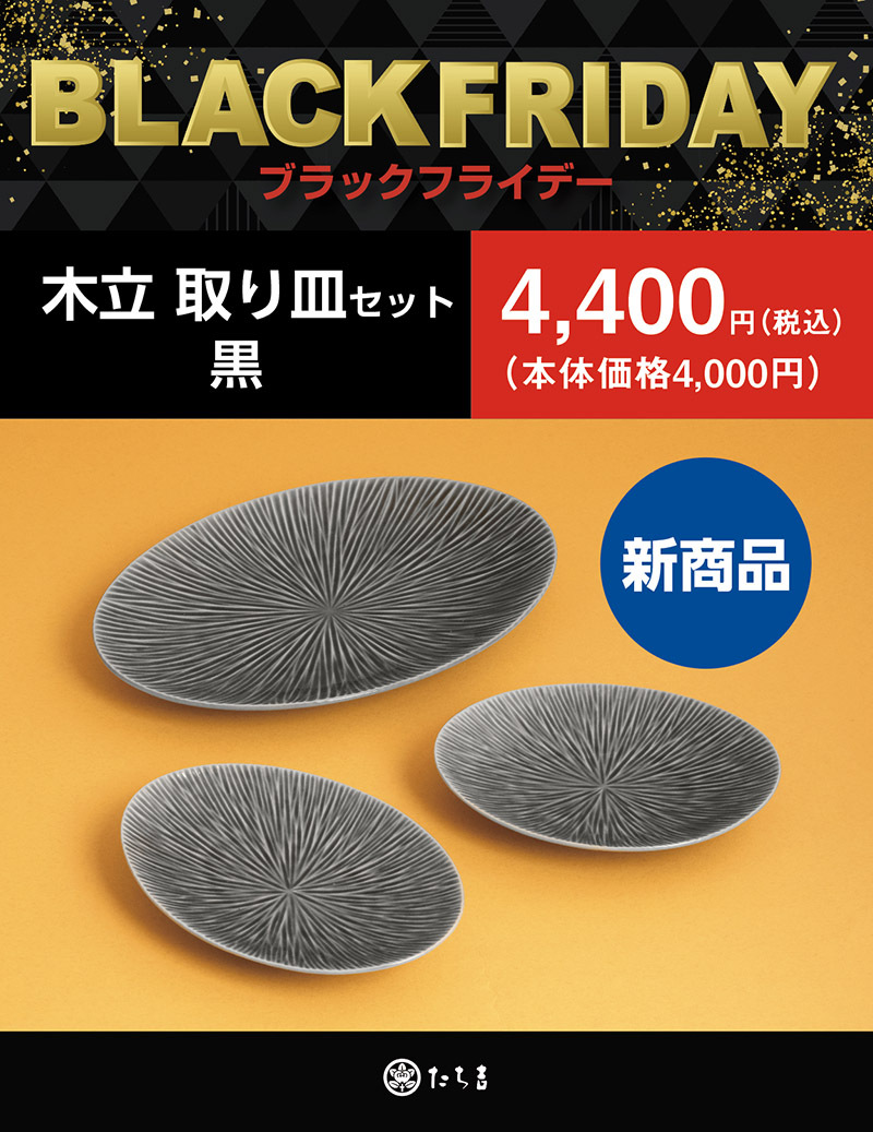 現在4色展開している木立シリーズにブラックフライデーの名前にちなんだ黒色と白色が使い勝手の良い中皿と取り皿のセットになって新登場。