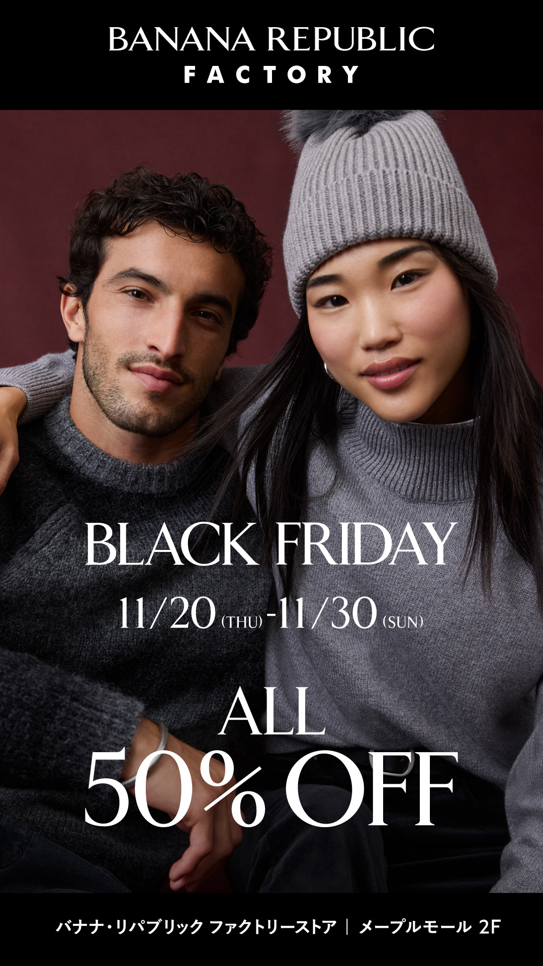 11/20(木) –11/30(日)の11日間、ブラックフライデー特別セールを実施中!店内全品が50%OFFでお求めいただけます。これから使えるアウター、セーター、パンツなど多数入荷しました。一部期間限定特別プライスのアイテムは50%OFF以上の割引でとってもお得に!!!ぜひこの機会にメープルモール2Fのバナナ・リパブリックファクトリーストアへお立ち寄りください。