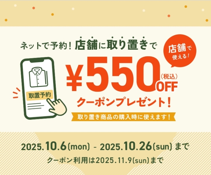 期間中にオンラインショップにて「取り置き予約」サービスをご利用いただいた方へのお得なキャンペーンです。店舗で商品が確保できたタイミングでクーポン付きメールが届き、取り置き商品にお使いいただけます。ぜひご利用ください。