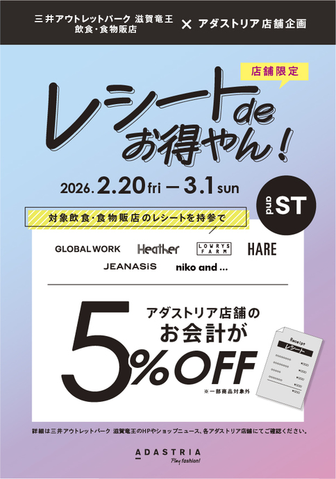 【アダストリア × 飲食・食物販店】2/20(金)~3/1(日) 『レシートdeお得やん』開催♪