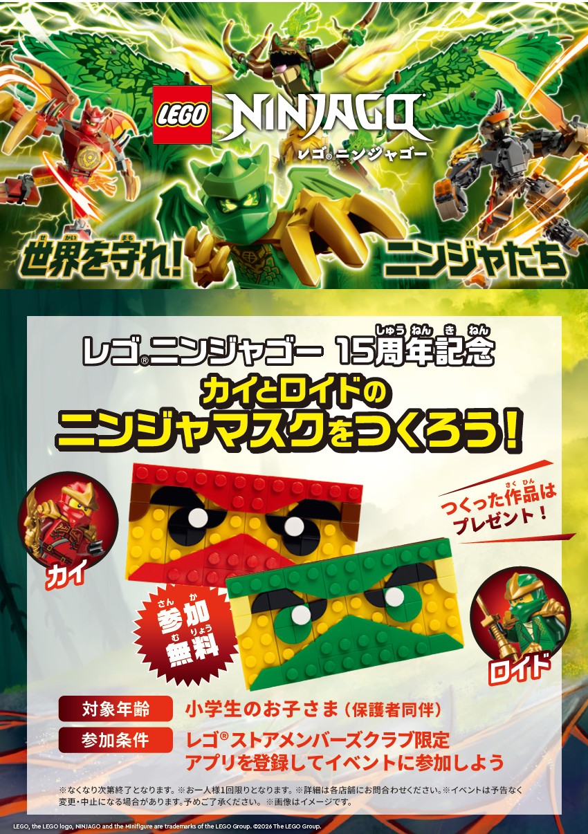 【1/12(月・祝)開催】レゴ®ニンジャゴー15周年記念!カイとロイドのニンジャマスクをつくろう!