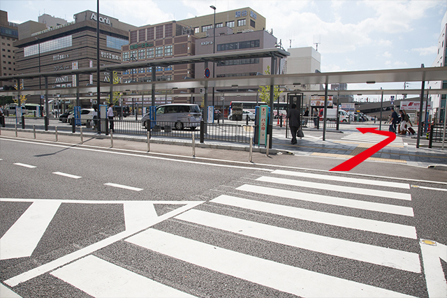 4.走上樓梯後,穿越斑馬線過馬路,朝2號巴士乘車處前進。(標示圓圈處)