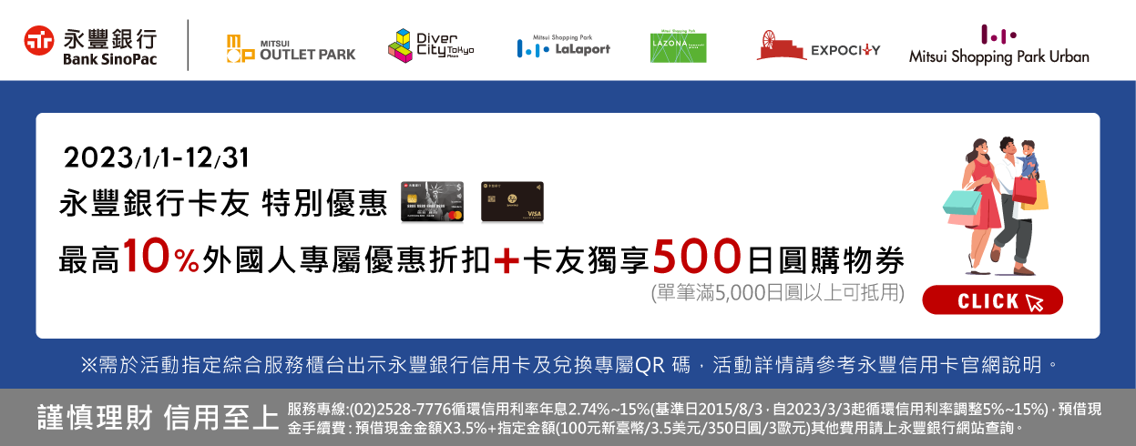 可使用VISA、JCB、MASTER、美國運通以及Diners Club的信用卡。