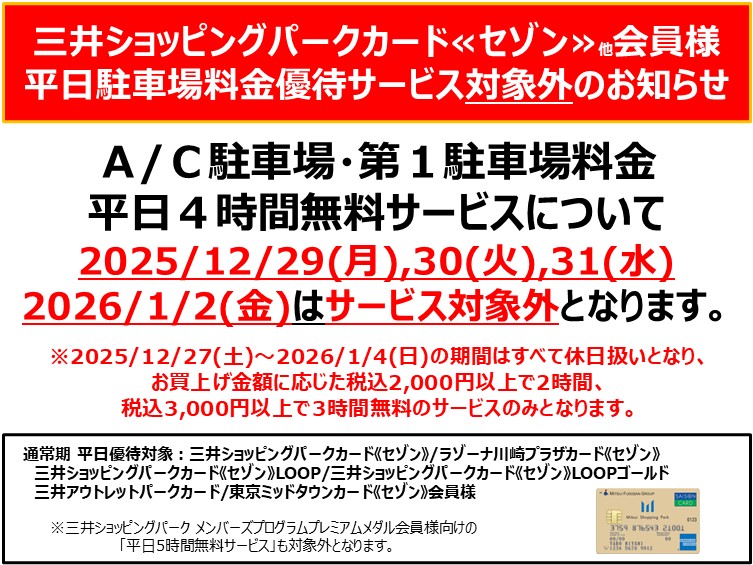 ※ご優待として提供させていただいております「A/C駐車場+第1駐車場料金 平日4時間無料サービス 」につきまして、下記日程についてはサービス対象外となります。
