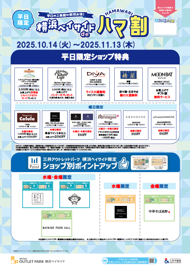 - 【平日限定】横浜ベイサイドdeハマ割!ショップ特典&ショップ別ポイントアップ!