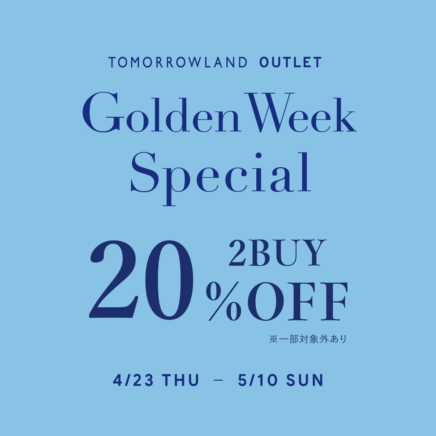 トゥモローランド アウトレットショップ各店では、4月23日(木)~5月10日(日)の期間、2点以上お買上げでレジにてさらに20%OFFでご提供いたします。