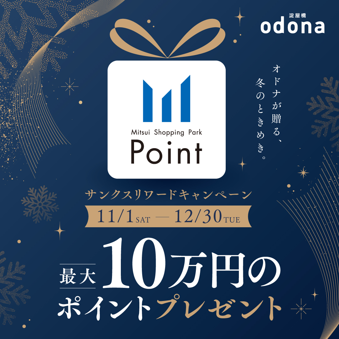※当選ポイントは淀屋橋odonaでのみ利用可能な期間・用途限定ポイントです。付与されたポイントの詳細は三井ショッピングパークアプリまたはメンバーズページにてご確認いただけます。