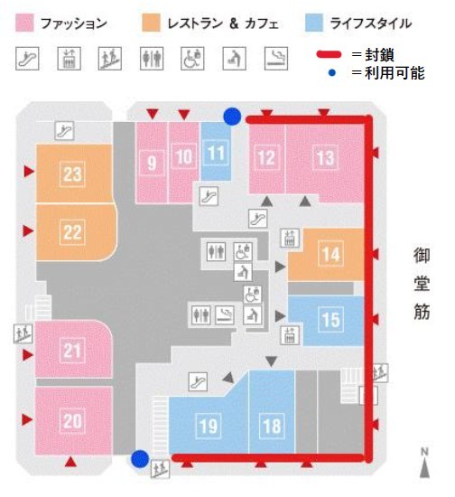 お客様の安全確保のため、当日は御堂筋側の施設エントランス・一部店舗の外側出入口を封鎖させていただきます。