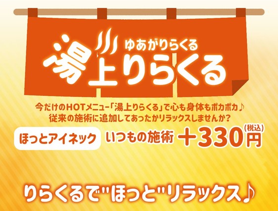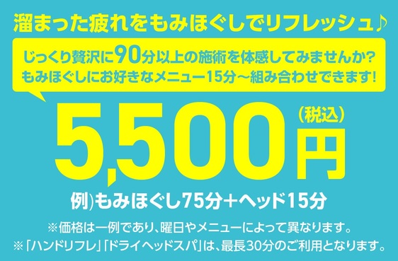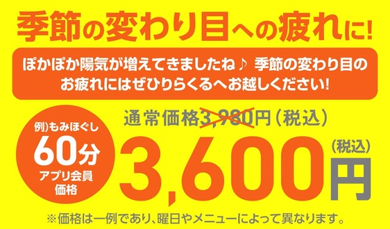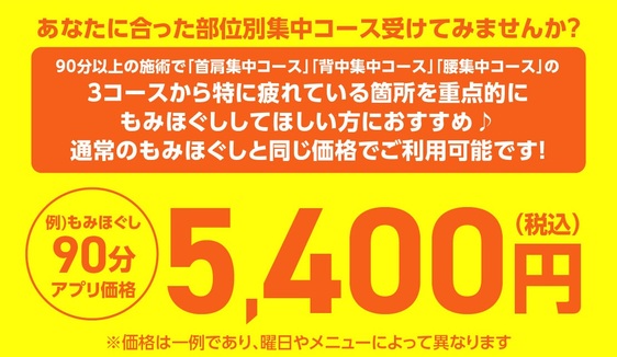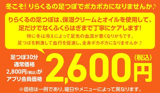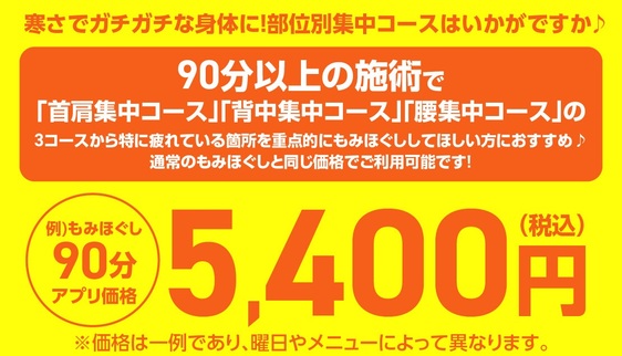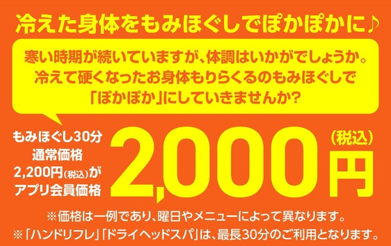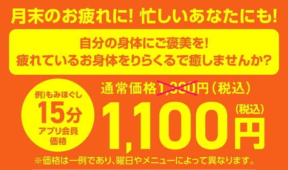 技術力の高いスタッフを集め、安くて上手いリラクゼーションサロンを目指しました。安いからといって技術・接客・雰囲気に至るまで絶対の自信があります!全てベッドでオールハンド施術致します。 <ポイントカード・SNS・アプリ情報> 【ポイントカード】 サービスご利用30分ずつで10ポイント、10ポイント=10円としてご利用可能。※300ポイント以上でご利用可。 【アプリ (Google Play)】 【アプリ (APP Store)】 ご利用の施術履歴・ポイントの確認が可能。 【twitter】 【Facebook】 【instagram】