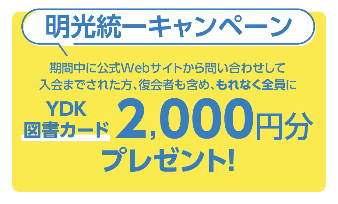 期間中に公式Webサイトから問い合わせして入会までされた方、復会者も含め、もれなく全員に 「YDK図書カード2,000円分」プレゼント!