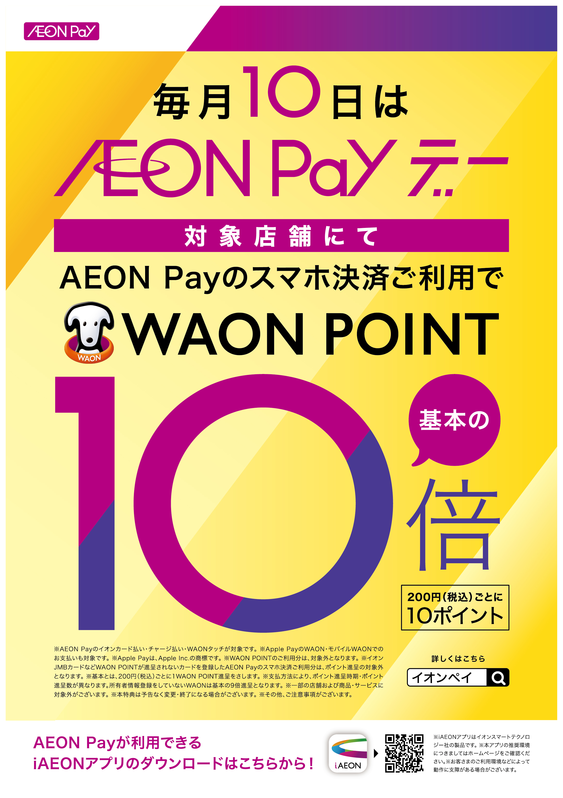 毎月10日はAEONPay10倍、イオンカード、WAONカードでポイント5倍を実施中です。