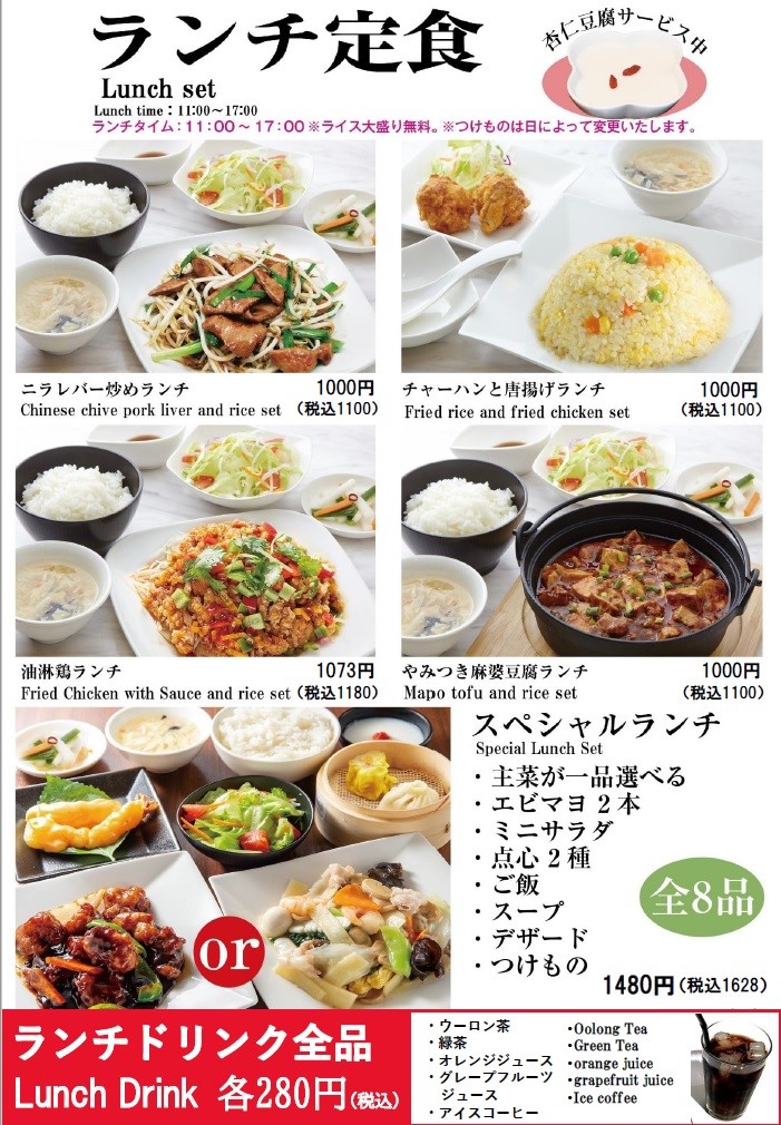 備有其他可選擇主菜的各種套餐、配菜及午餐飲料。