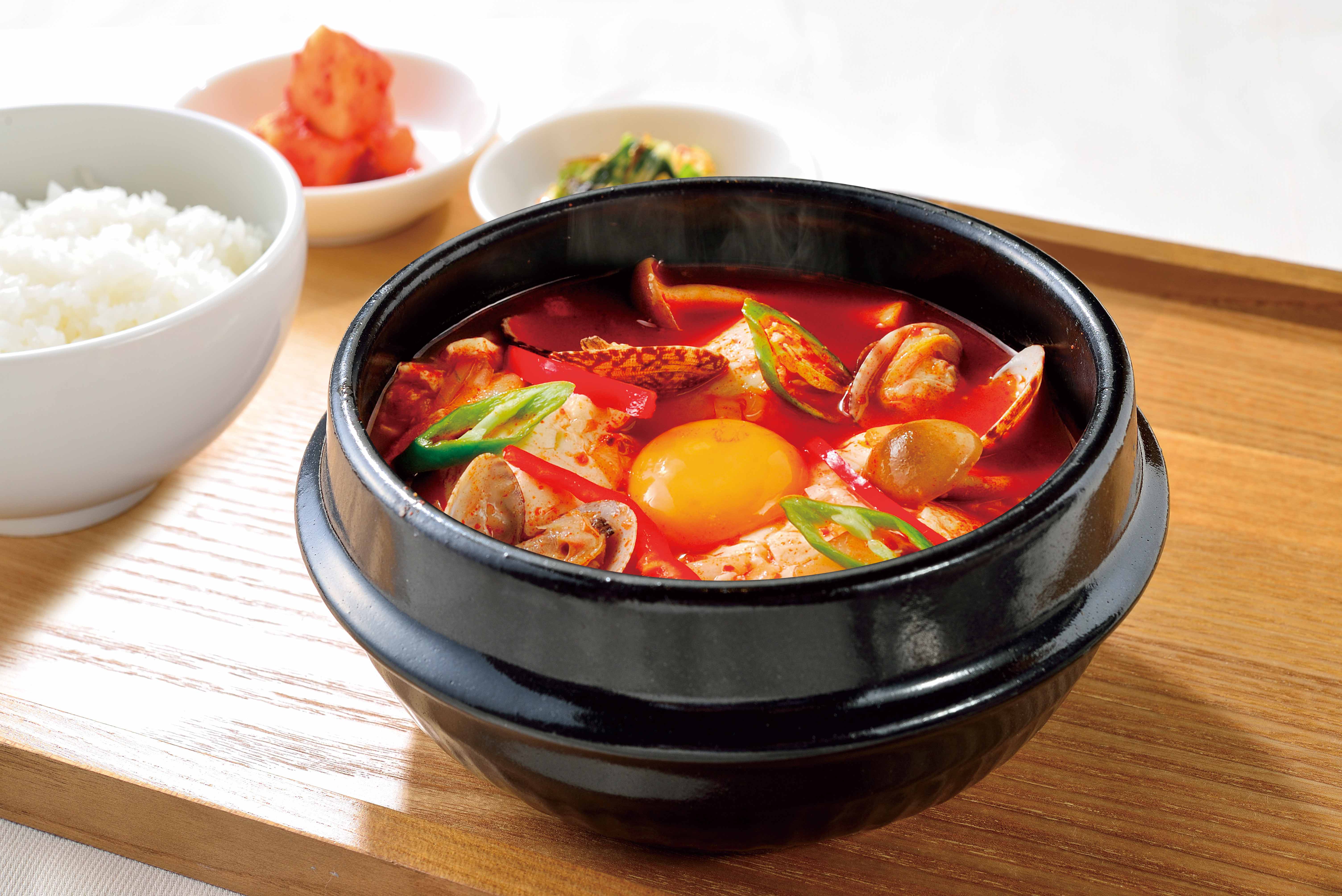 自家製タテギを使った熱々のスンドゥブチゲセット、食欲をそそる少し辛めのスープが絶妙。