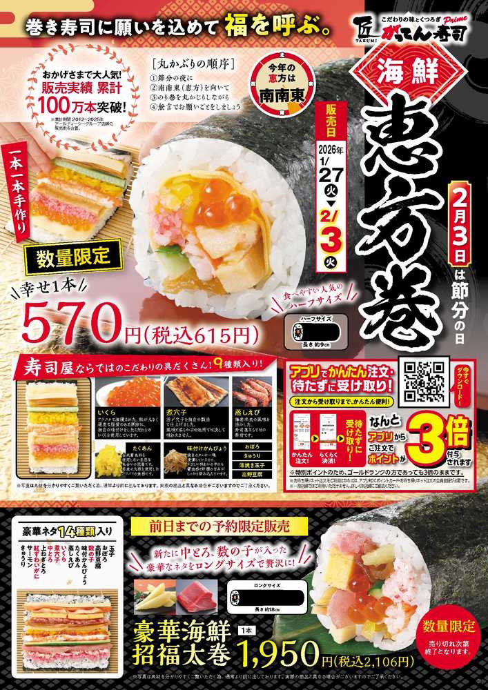 2月3日は節分の日‼ 匠がってん寿司の海鮮恵方巻のご予約承り中♪