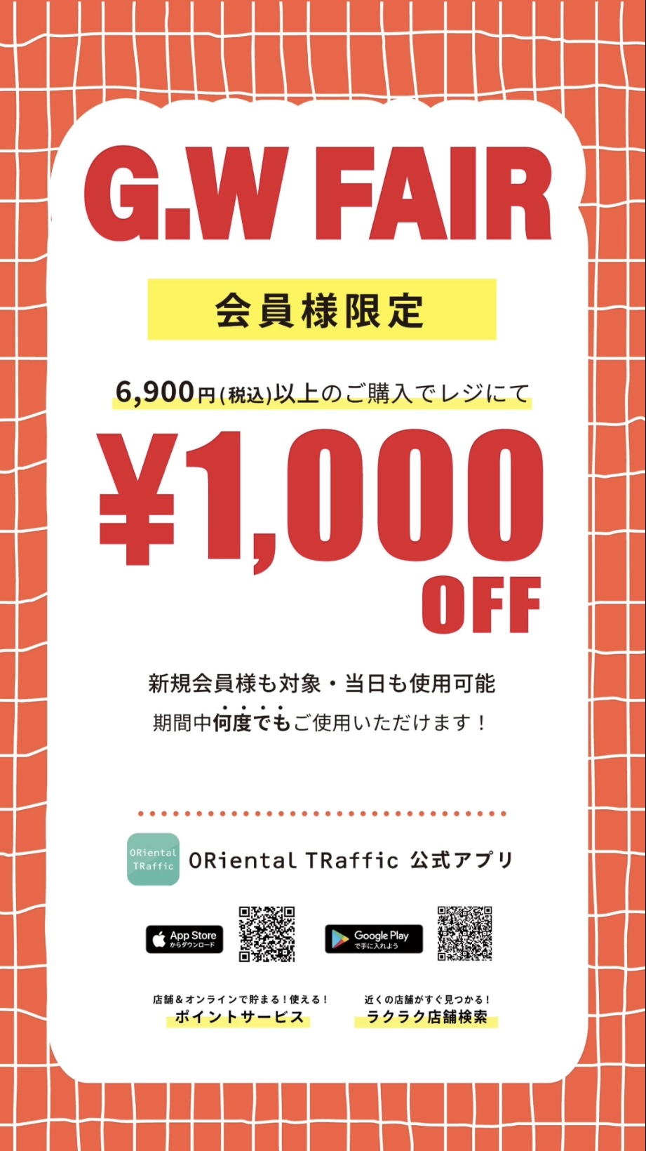 購買6,900日元 (含稅) 以上在收銀臺結賬時優惠1,000日元!
