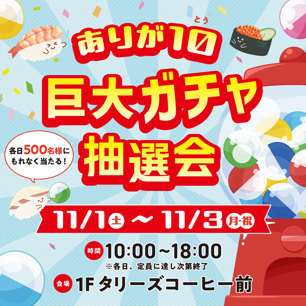 【參加條件】11月1日(週六)至11月3日(週一、假日)期間,在2家以上店舖購物滿5,000日元(含稅/可合併)並出示符合條件的非現金支付收據,即可獲得1次參加巨型扭蛋抽獎的資格。