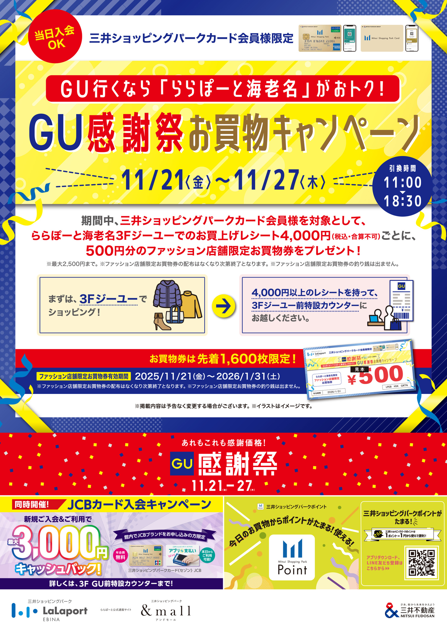 活動期間,三井購物公園卡會員在LaLaport海老名GU GU消費滿4000日元(含稅,不可與其他優惠疊加使用),即可獲贈一張價值500日元的時尚類購物券!數量有限,先到先得,僅限前1600名顧客!