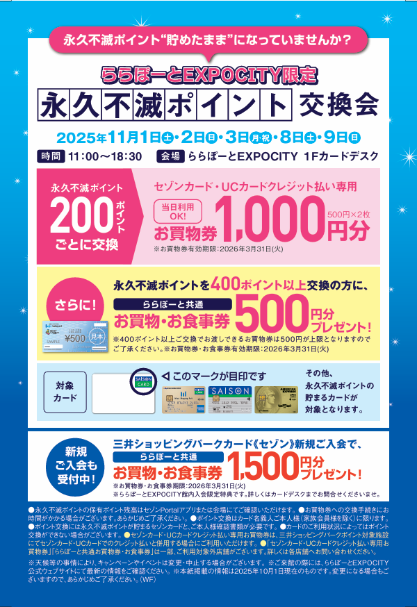 - [11月1日(週六)- 11月3日(週一,假日),11月8日(週六)- 11月9日(週日)] LaLaport EXPOCITY獨家永恆積分兌換活動