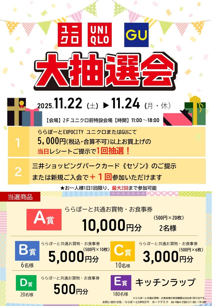 11月22日(星期六)至24日(星期一,假日),在UNIQLO或GU at LaLaport EXPOCITY消費滿5000日元(含稅,不可合併)後,憑購物小票即可參加抽獎,抽獎活動將於當日在抽獎地點舉行!
