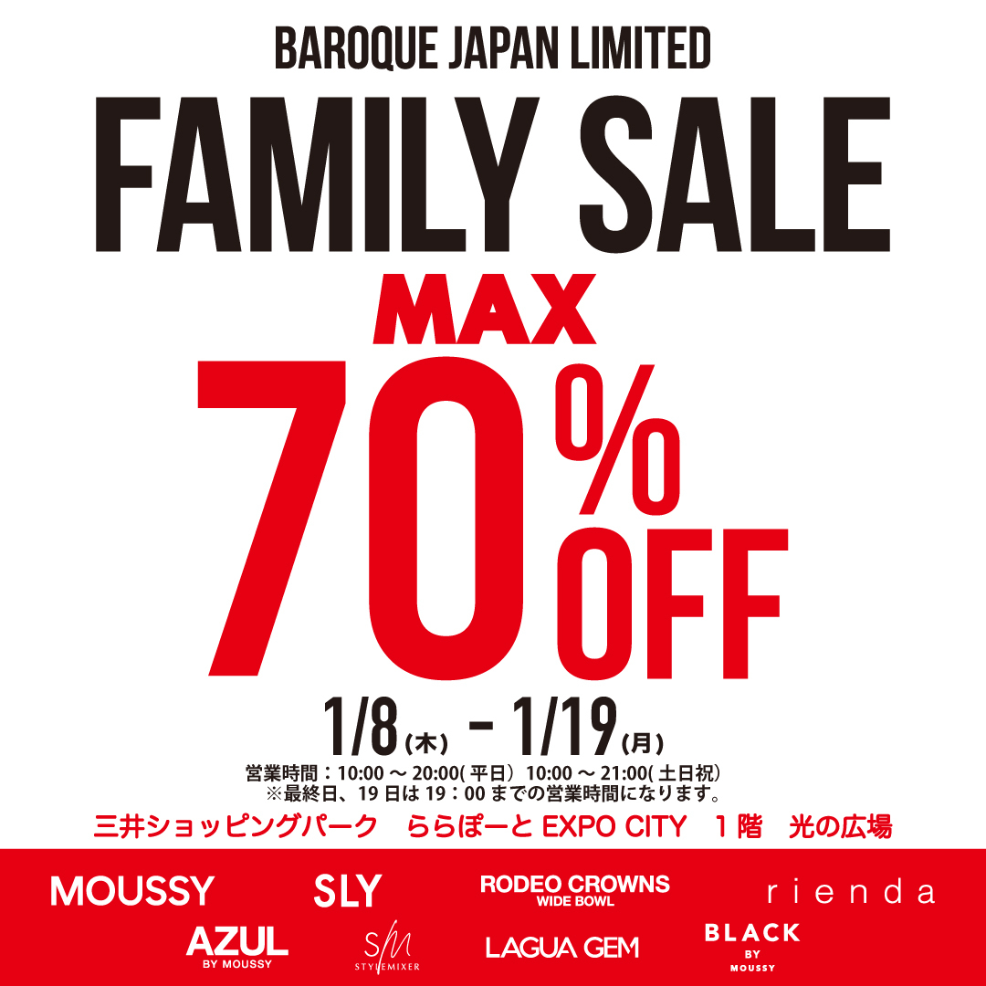 - [1/8-1/19] BAROQUE JAPAN LIMITED 新年特賣會在LaLaport EXPO CITY 舉行