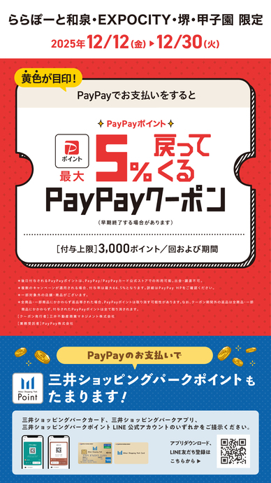 【12/12 (周五) ~12/30 (周二) 】 使用PayPay支付,PayPay最多可返還5%積分的優惠券!